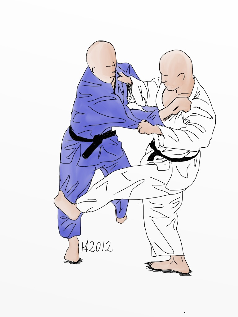 A technique to throw down the opponent by breaking his balance forward and hold his right knee with the left foot to rotate him around it.