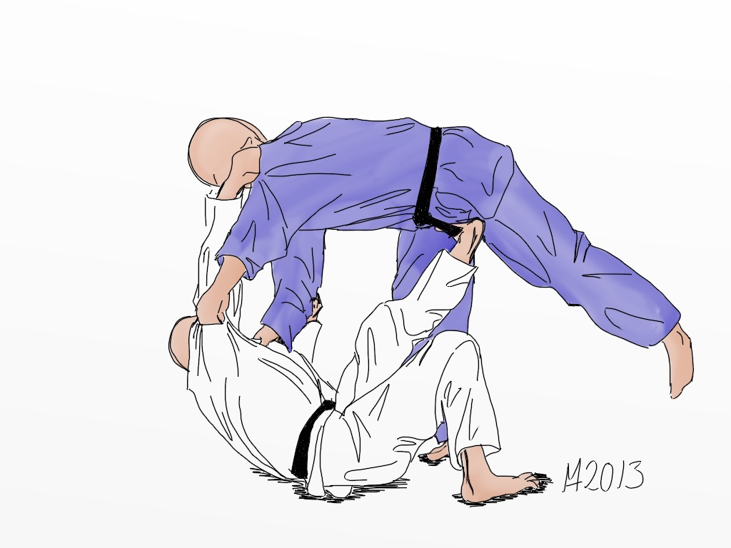 A technique to throw the opponent over the head by breaking his balance forward and putting the right sole on his lower abdomen while laying down the body onto the back.