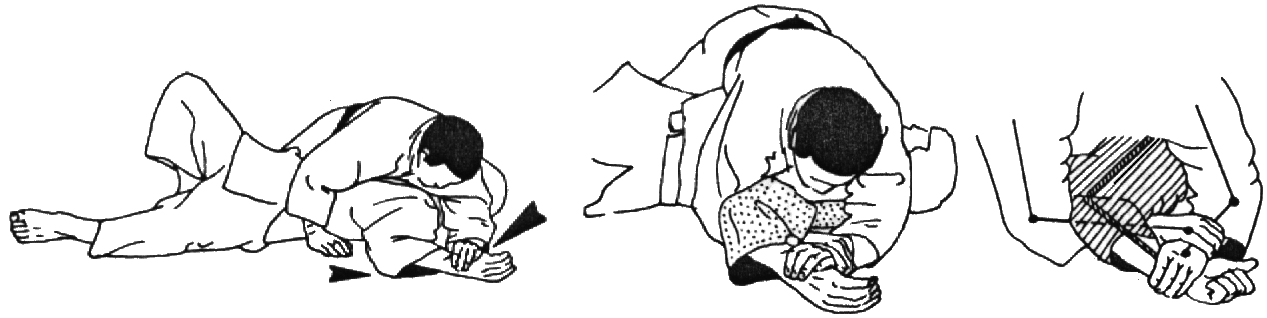 A technique to twist and lock the opponent’s elbow joint by grabbing his left wrist with the left hand from the right side of the opponent lying on his back and inserting the right hand to grip one’s left wrist underneath his upper arm.