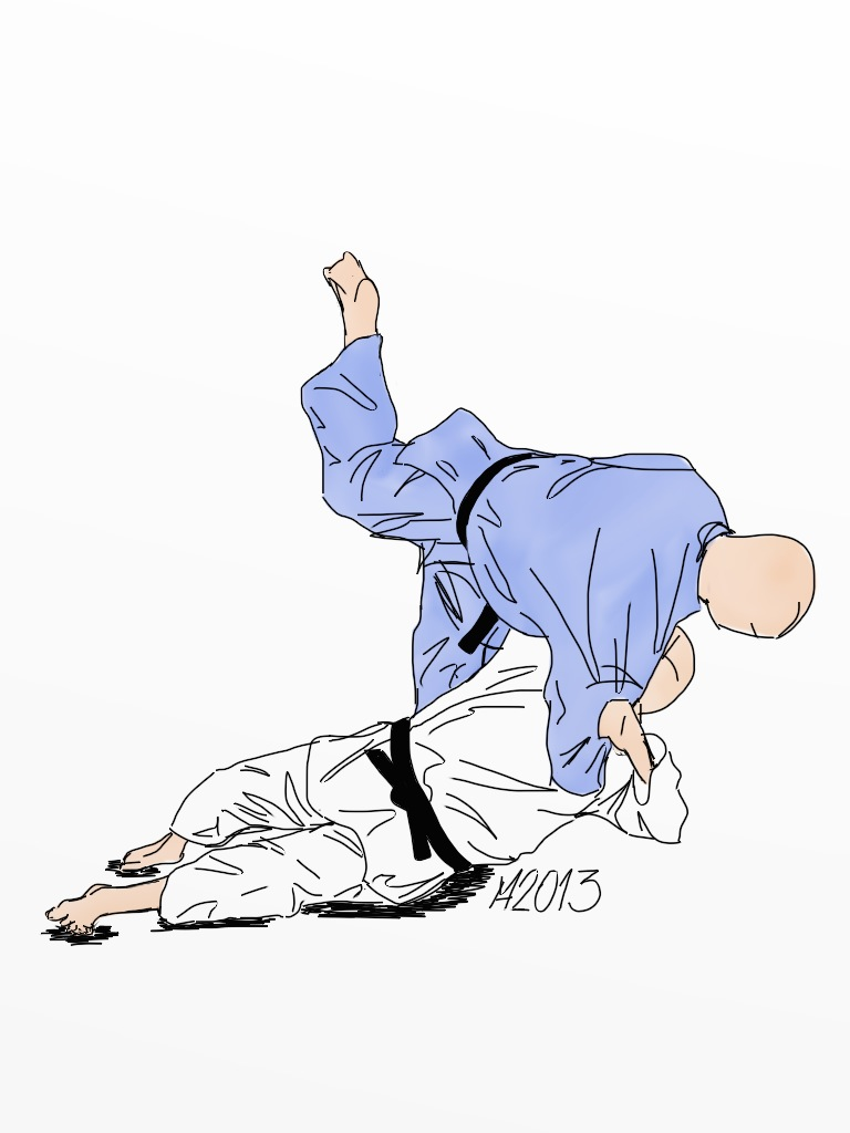 A technique to throw down the opponent by breaking his balance forward and stepping both feet onto the outside of his right foot while laying down the body onto the left side and rotating him over the body.